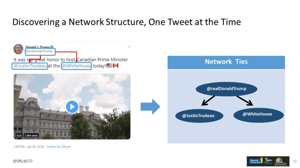 To study how information and misinformation propagates through different online networks, we use a method called Social Network Analysis (SNA). SNA is a powerful technique to visualize and examine user interactions at scale. To analyze Twitter data using SNA, we first need to represent it as a network, where nodes represent Twitter users (individuals or organizations) and connections between nodes (called ties) represent interactions among users (reply, retweet or mention). For instance, a single tweet posted by Donald Trump to the @JustinTrudeau and @WhiteHouse accounts can be visualized as a simple network with three nodes, and two ties going from Trump’s account to the two accounts because both are mentioned in the tweet (Figure 2).