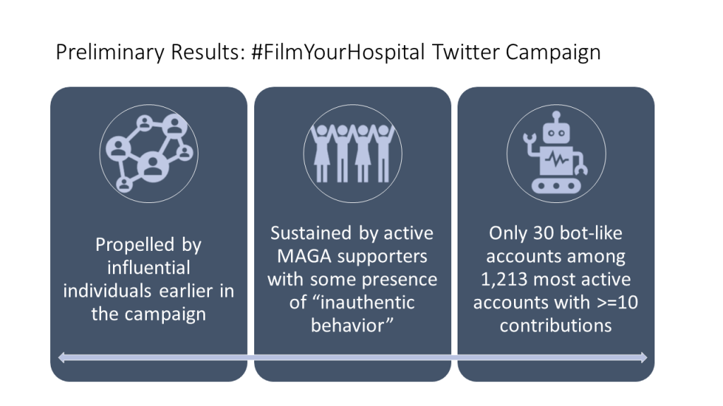 Our analysis suggests that while the #FilmYourHospital campaign on Twitter is full of misleading and false COVID-19 claims, most of the active and influential accounts behind it don’t appear to be automated. However, we did find signs of ad hoc coordination among conservative internet personalities and far right groups attempting to take a baseless conspiracy theory and turn it into a weapon against their political opponents.
