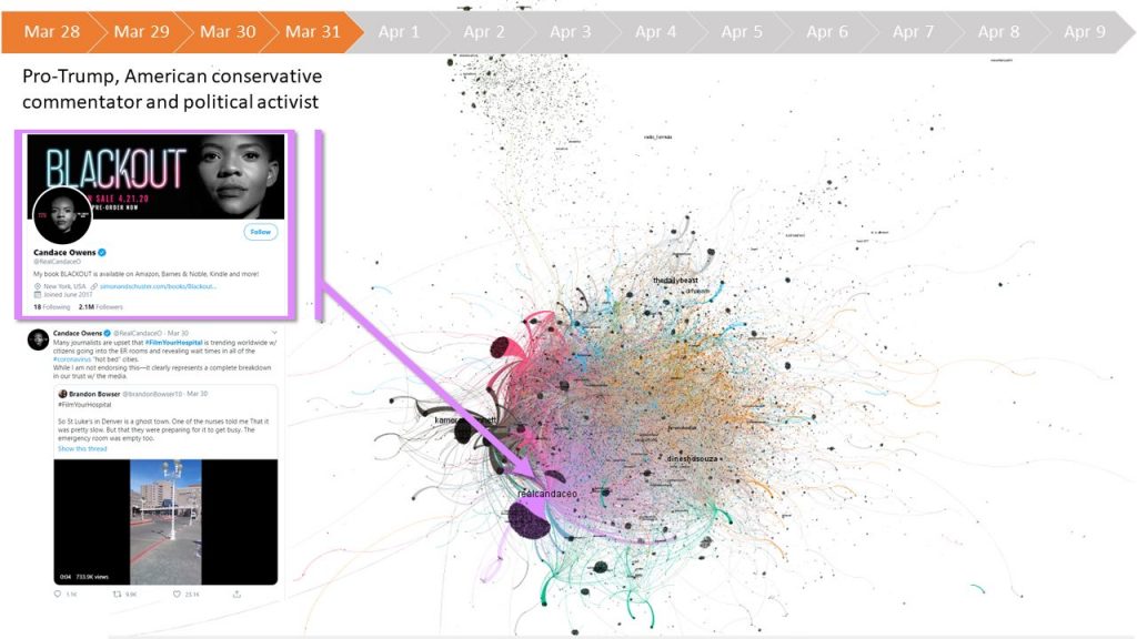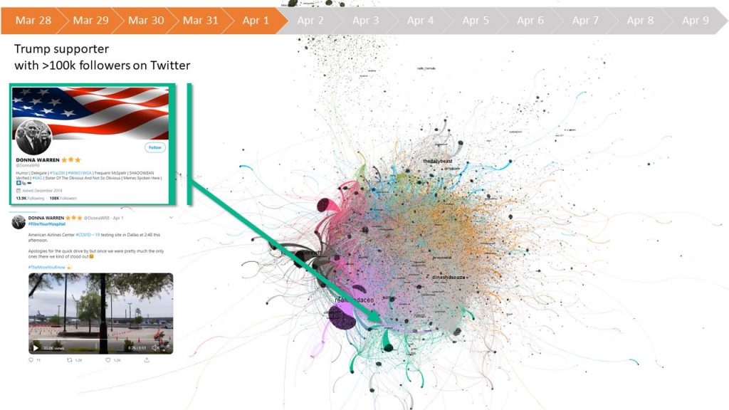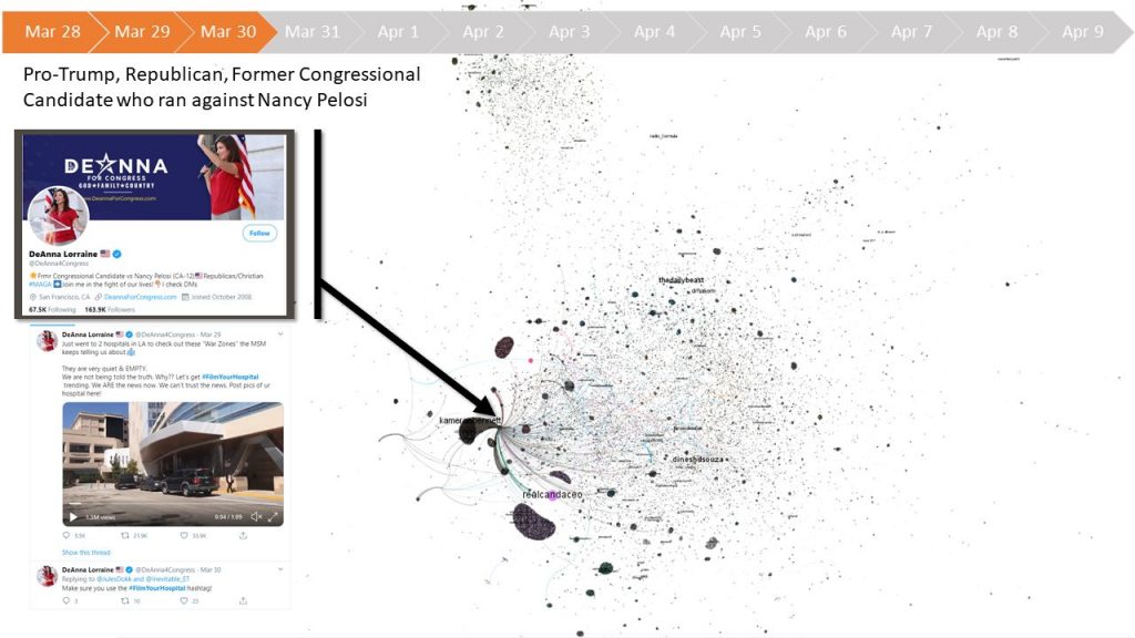 To understand how this particular campaign manifested on Twitter, let’s examine the formation of this network over time. Figure 4a displays #FilmYourHospital interactions posted during the first three days of the campaign. Notably, one of the most influential users who triggered the viral spread of this misinformation campaign was @DeAnna4Congress, a verified account for DeAnna Lorraine, a former Republican Congressional candidate who recently ran against Nancy Pelosi for the U.S. House California District 12. Unlike the anonymous poster who started the hashtag (attracting only around 30 retweets), Ms. Lorraine added the legitimacy to this campaign and directly asked her 150k+ followers to “get #FilmYourHospital trending” and “[p]ost pics of ur hospital here!”.