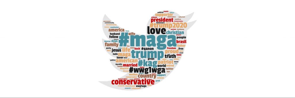 While influential conservative politicians and activists are behind some of the most shared and early content in this network, the question remains about who is behind the retweets that formed the majority of interactions and sustained the network passed the initiation stage. To answer this question, we examined the most active accounts in this network and the most frequently used keywords in the account bios (see Figure 5). The majority of users who posted a tweet using this hashtag self-describe themselves as Trump supporters and used words and hashtags such as #MAGA (Make America Great Again), #KAG (Keep America Great), and #trump2020.