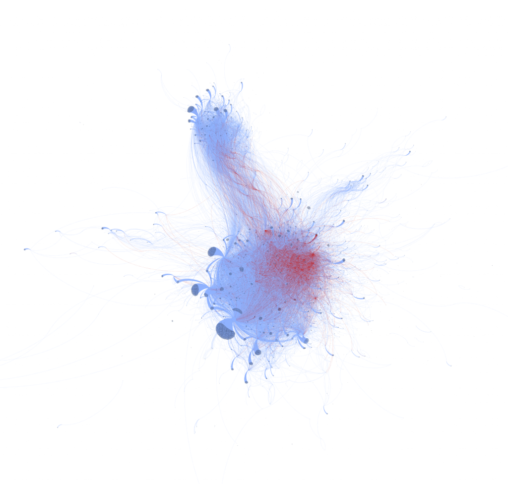 From our analysis, as of April 17, we identified 1,059 accounts in the network that were either suspended or temporarily restricted by Twitter. We then used this information to highlight the corresponding nodes and interactions in the network visualization in red (see Figure 7). Based on the visualization, while temporary or permanently suspended accounts appear to be spread out across the network, they are especially concentrated in the top right corner. This is interesting because this is the part of the network that was especially active during the second period of the campaign.