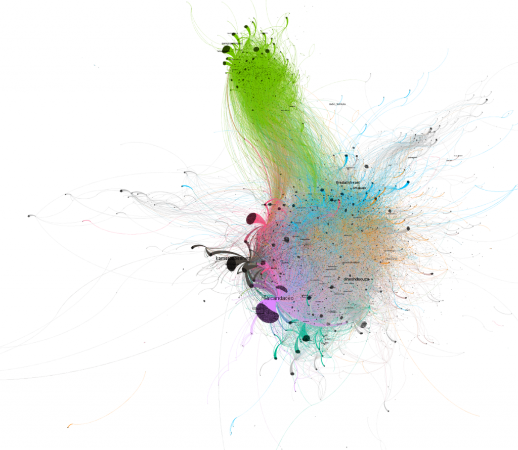 During the subsequent two days (Figures 4b and 4c), the network “lit” up with mostly retweets of tweets posted by prominent conservative commentators and political activists like @realcandaceo (with 2M followers) and @DonnaWR8 (with 100K followers), an account with a fan at the White House.