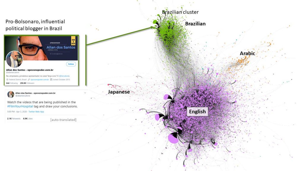 And while the majority of users appear to be Trump supporters from the U.S., seven days after the initial #filmyourhospital tweet, on April 3rd the hashtag went international when a new cluster of users from Brazil emerged. It is shown as a green-color grouping of nodes in the top corner of the network visualization (Figure 6). Most of the tweets in this cluster were around popular conservative commentators and activists from Brazil such as @allantercalivre, Allan dos Santos – a self-described businessman, journalist, blogger and a prominent pro-Bolsonaro supporter. While interesting, the spread of this campaign in Brazil is not surprising. U.S.-style politics has been creeping into the Brazilian society over the past few years, culminating with the election of Jair Bolsonaro, a far-right candidate during the 2018 Presidential Election (more on this here and here).