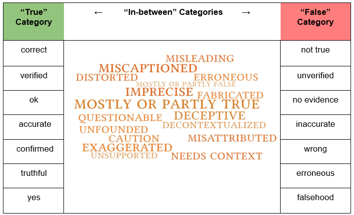 The need to use multiple categories to label a claim often arises when the truthfulness of a claim cannot be determined by a binary label of true or false. As a result, depending on a rating system, there may be one or more other “in-between” categories that are being used to describe claims that are neither completely true nor false (see Figure 3).