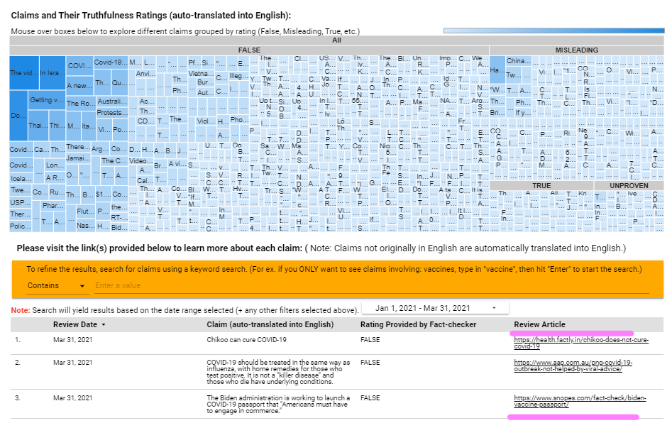 To avoid information loss from such standardization, we include a direct link to the Review Article provided by a fact-checker (see the “Review Article” column in the COVIDGlobal Misinformation Dashboard as shown in Figure 4).