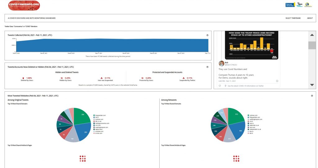 Do you know who is behind that Twitter account tweeting about the coronavirus? Is it a human or bot? The COVID-19 Bots Dashboard is a data visualization tool designed to help users, journalists, and researchers to monitor the health of coronavirus discussions on Twitter. It analyzes publicly available posts from Twitter to spot the use of automation a.k.a. ‘bots’. The information on this this dashboard is based on an automated real-time analysis of a large sample of English tweets containing keywords “Coronavirus” or “COVID”, as provided by Twitter’s Streaming API.